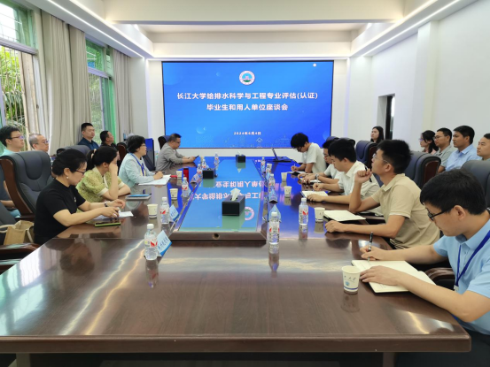 于10教205会议室召开给排水科学与工程专业评估(认证)毕业生和用人单位座谈会。评估专家组组长、太原理工大学岳秀萍教授,中铁七局、中铁广州局、汉阳市政等10家用人单位及14名毕业生代表参加座谈会。