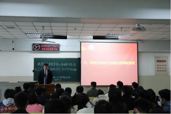 嘹亮的国歌声后,第十八届院学生会负责人李嘉伟介绍了新一届团委学生会各部门情况。李嘉伟表示,学生会成员将会以“服务城建青年,发展城建青年”的理念努力奋斗。会上还通报表扬了学院在学校第十八届运动会上取得的佳绩,向体育部等院团委学生会成员的付出表示感谢。
