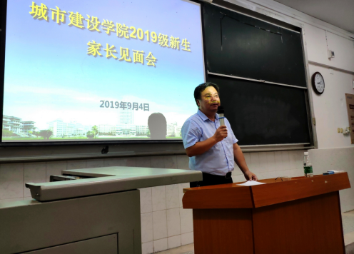 设计研究院基本情况,阐述了土木工程、给排水工程、建筑学、工程管理、城乡规划五大本科专业学科交叉、文理交融的学科群特点。在教学特色方面,他指出,学院土木工程专业是省级重点专业,并通过教育部专业认证,已经和国际接轨。同时,学院的工学交替、体验建造等活动持续开展,已成为学院培养应用型工程师的鲜明教学特色。最后,他代表学院再次表达了对家长和新生的欢迎,勉励同学们励志求学、努力成才。
