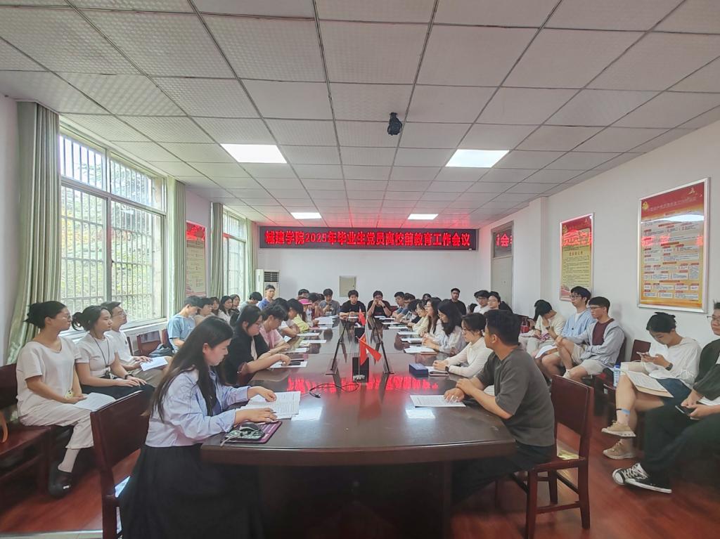 在9教208室组织召开2025届毕业生党员离校前专题教育会。学院党委副书记周洁如、党建秘书胡冰恒、学生党建工作负责人刘安琪及全体毕业生党员参加会议。