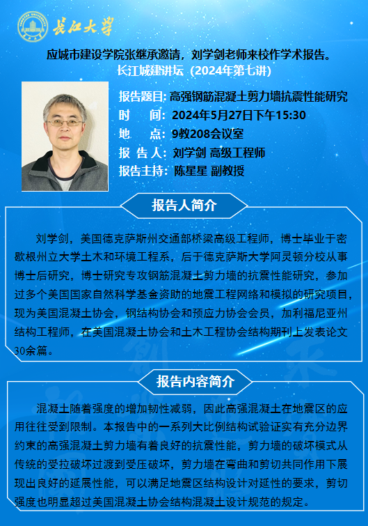长江城建讲坛2024年第七讲:高强钢筋混凝土剪力墙抗震性能研究