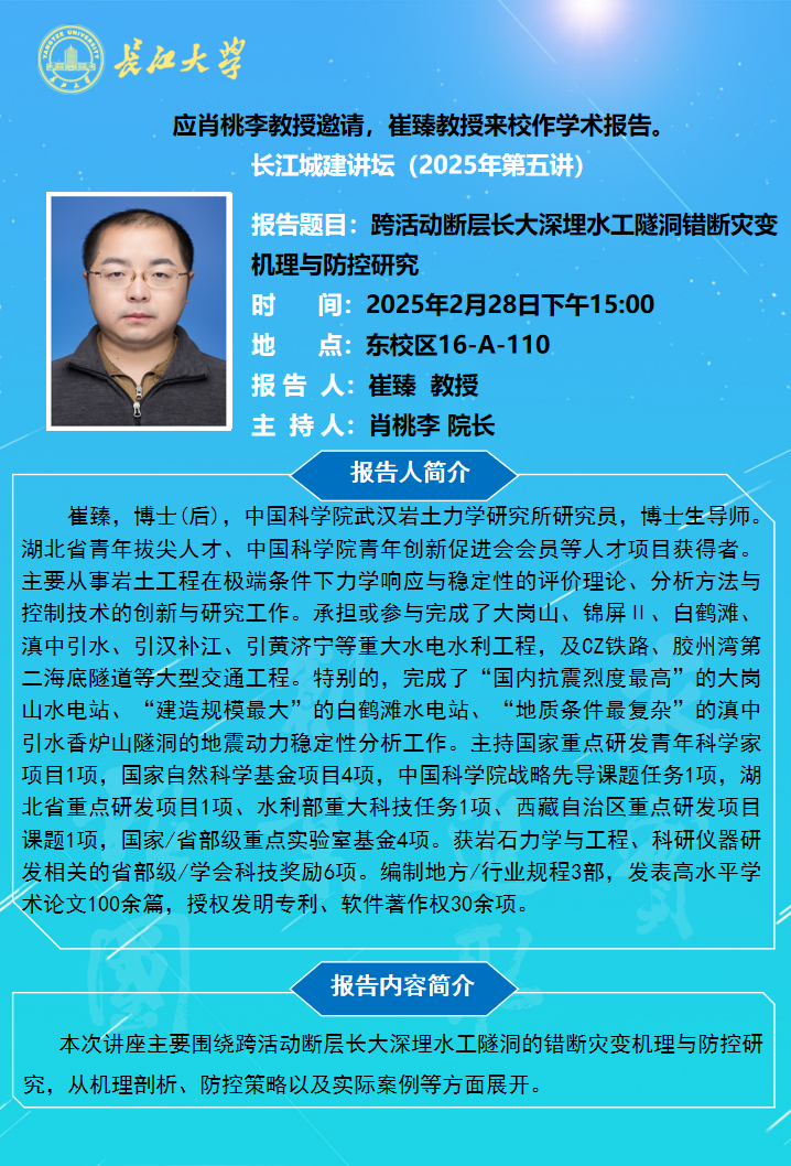 长江城建讲坛2025年第五讲:跨活动断层长大深埋水工隧洞错断灾变机理与防控研究
