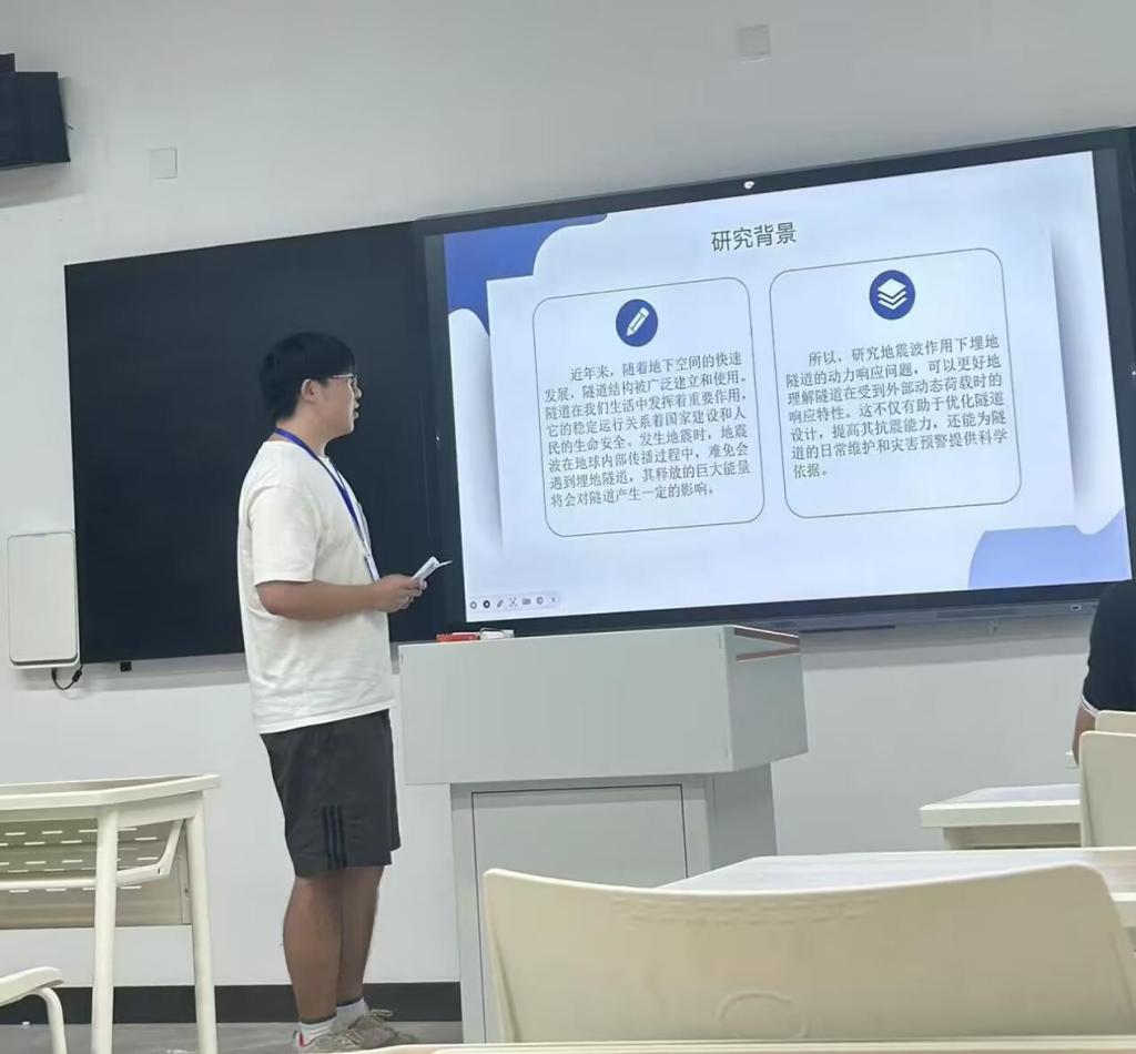 2023级研究生易舜在论坛中以“SH波作用下城门洞形隧道动力响应分析”为主题进行了汇报,内容主要以全空间中的深埋城门洞形隧道为研究对象,以间接边界积分方程法(IBIEM)和弹性波动理论为基础,对在平面SH波作用下的城门洞形隧道的动力响应问题展开研究,旨在更好地理解隧道在受到外部动态荷载时的响应特性。这不仅有助于优化隧道设计,提高其抗震能力,还能为隧道的日常维护和灾害预警提供科学依据。