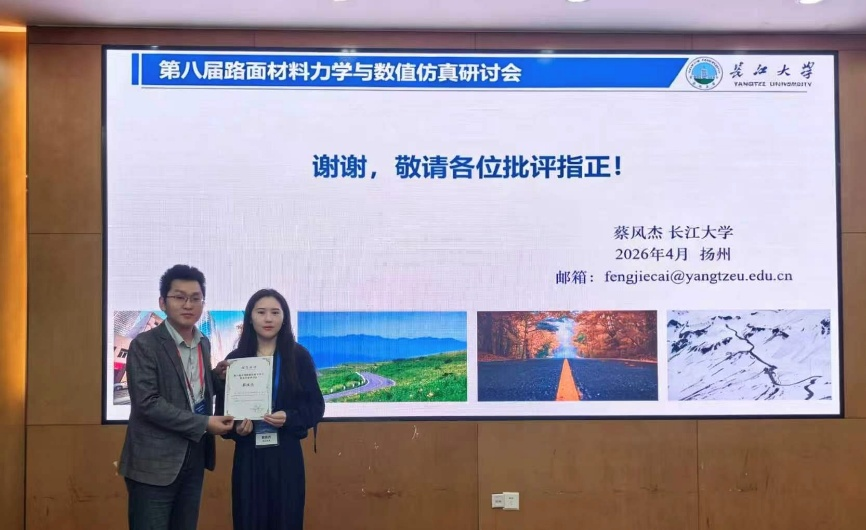 为加强路面材料领域学术交流,推动道路工程学科发展,2026年4月10日至12日,第八届全国路面材料力学与数值仿真研讨会在江苏扬州召开。本次会议以“人工智能时代道路工程的新机遇与新挑战”为主题,围绕高维数据分析、复杂规律挖掘与过程智能建模等前沿方向展开深入研讨。学院蔡凤杰、张宏飞两位教师参加了本次会议。