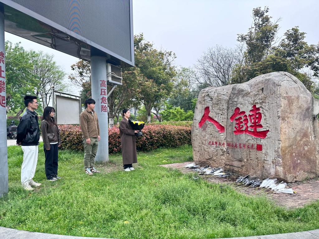 学生代表向“人链”纪念碑献花,深切悼念陈及时、何方旭、方招三位烈士。