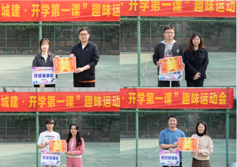 趣味运动会结束后,学院四个奖项:“团队风采奖”、“道德风尚奖”、“最佳组织奖”、“阳光活力奖”分别由建规2班、土木1班、土木2班、建规1班获得,并由李振老师、周喆老师、盖东芳老师、胡冰恒老师亲自颁奖。