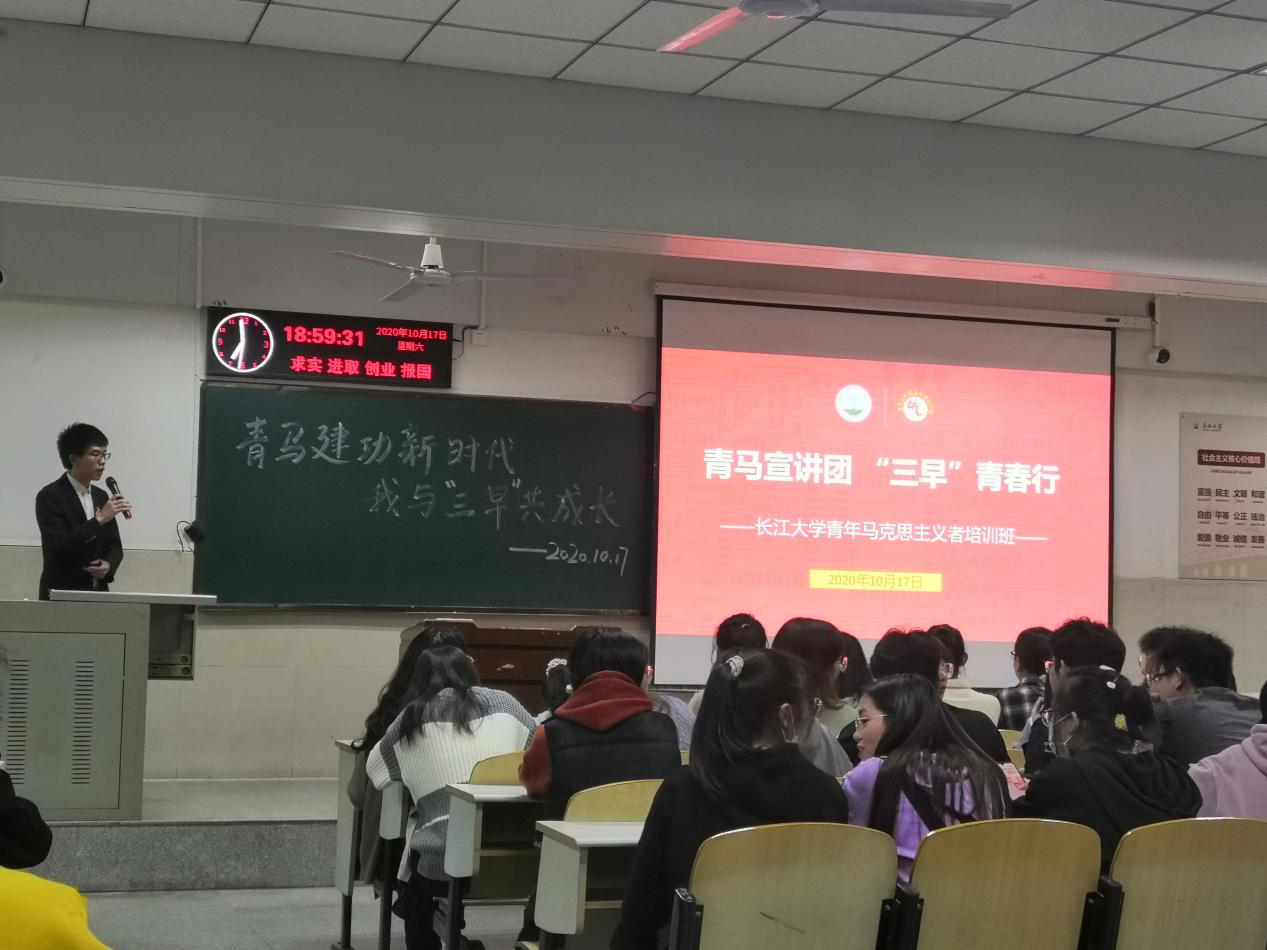 会上,宣讲团成员华丹详细介绍了青马班审批的流程,积极鼓励大家参加青马班,使自己在意识形态方面更加靠近社会主义核心价值观。宣讲团成员谈道:“ “三早”是什么?在2019年色色视频