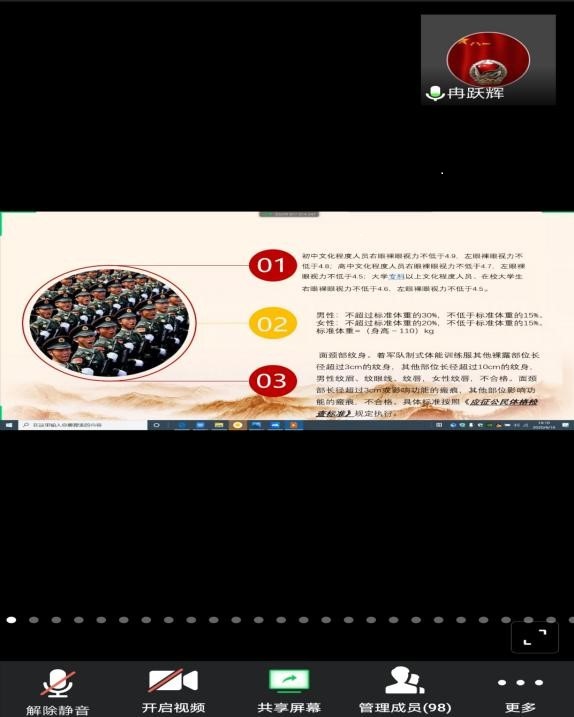 于4月16日下午两点召开主题为“我和军旅有一个约定”的线上大学生征兵宣讲会。学院18级辅导员魏民生、19级辅导员何儒权和各年级学生干部及有入伍意愿的优秀青年大学生等近百人参加了宣讲会。