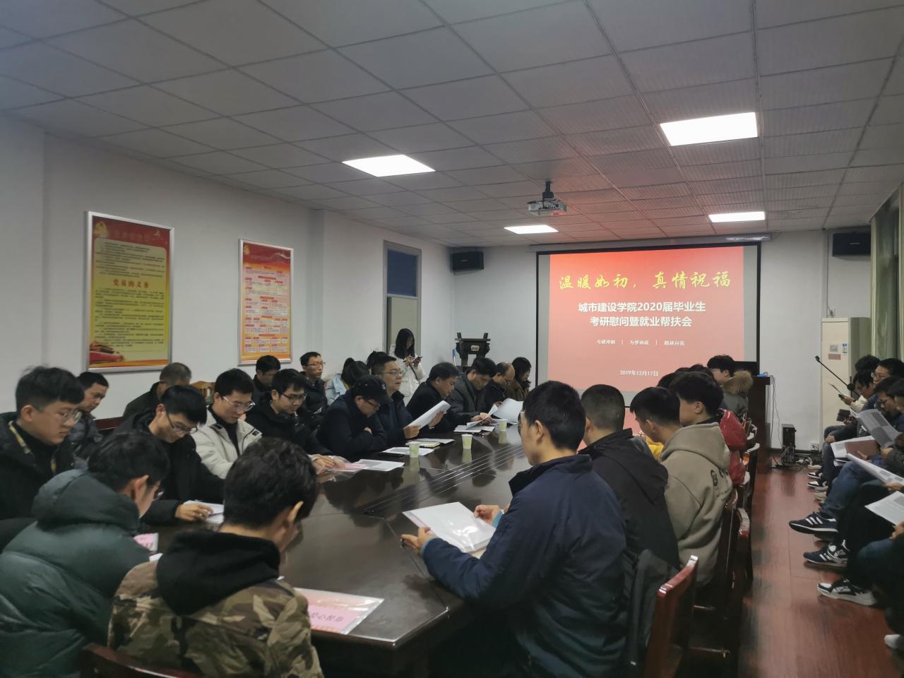 2020届毕业生考研慰问暨就业帮扶会”。学院党委书记孙涛老师、院长曾磊老师、学院党委副书记周俊老师、副院长肖桃李老师,还有毕业班班主任、就业指导老师及2020届毕业生代表参加了此次会议。会议由学院学工办主任周喆老师主持。