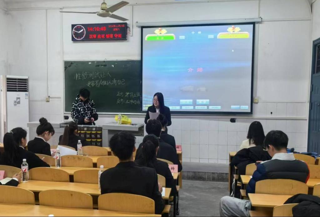 决赛现场,正反双方围绕着“性格测试是否让人认清自己”这一辩题进行激烈辩论,呈现了一场智慧交锋,赢得了阵阵掌声。辩论赛结束后,评委对辩手们进行了点评。最终,土木类32404班获本次“博弈杯”冠军。建筑类32403班获亚军,建筑类32401班获季军,建筑类32403班邹盼获“最佳辩友”称号。