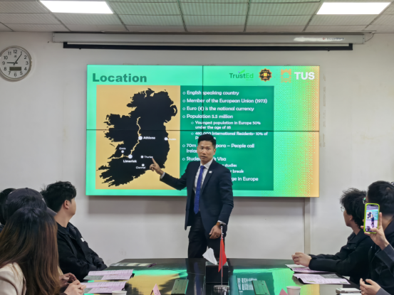 学生国际交流渠道,帮助有出国意向的学生明晰海外升学路径,4月1日,爱尔兰香农理工大学(TUS)亚太地区负责人孟晶一行来校访问,先后在院东校区、西校区举办中外合作专项座谈会。学院党委副书记周洁如,辅导员胡冰恒、刘安琪、袁子昂及中外合作专业学生参加座谈会。