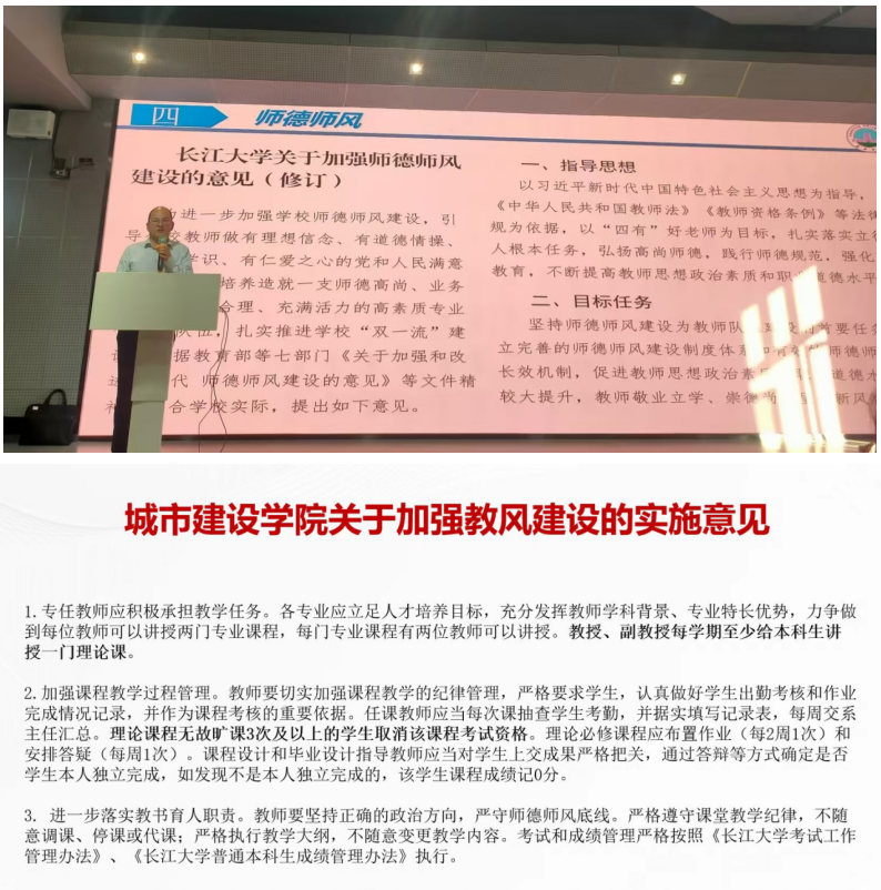土木工程学科硕士研究生导师选聘及指导名额分配办法(试行)》等管理办法,确保学院师德师风建设有章可循,有据可依。学院党委书记谌姿、党委副书记周洁如多次在全院教职工大会上强调考勤管理和学院会议管理,要求作为一名教师,要爱岗敬业,确保考勤纪律和会议到会规范。
